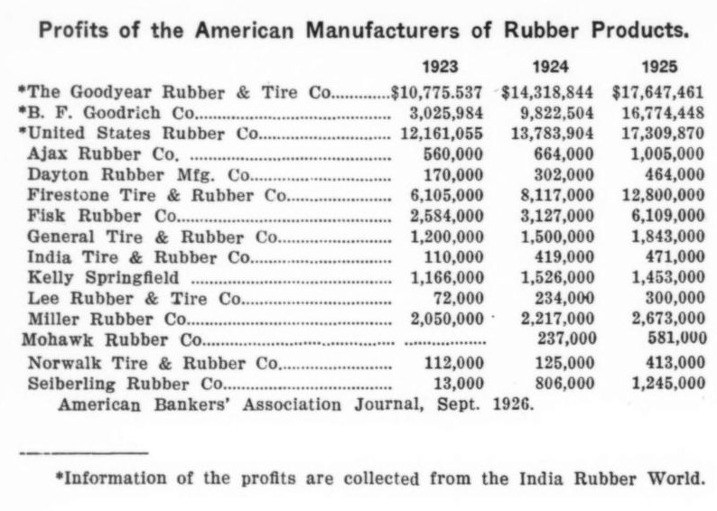 According to Harvey Firestone, the rubber industry is the best paying enterprise. The returns of the various rubber companies demonstrate that the dividends paid are as high as in steel, oil and other well paying industries. The profits in the rubber industry are classified into two categories.