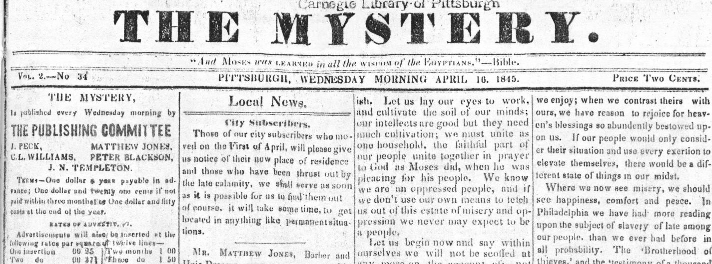 Before long even the limits of Pittsburg proved too confining; Delaney had messages which must be heard. And so in 1834 he edited a newspaper called “Mystery” which he conducted solely from his own resources for upwards of a year. Then he transferred the ownership to a group of six men but remained editor thereof for four years more. Many a stirring editorial appeared in these columns and Rollin thinks that through the influence of this sheet the Avery Fund was originated. The Rev. Charles Avery, stimulated by Delaney’s impassioned plea for resources to meet the social requirements of the colored man, first founded Avery College and on his death in 1858 left “one hundred and fifty thousand dollars for the education and elevation of the free colored people of the United States and Canada and one hundred and fifty thousand dollars for the enlightenment and civilization of the African race on the continent of Africa”.