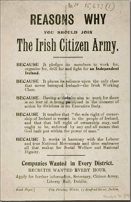 However it may be for others, for us of the Citizen Army there is but one ideal, an Ireland ruled and owned by Irish men and women, sovereign and independent from the center to the sea, and flying its own flag outward over all the oceans.