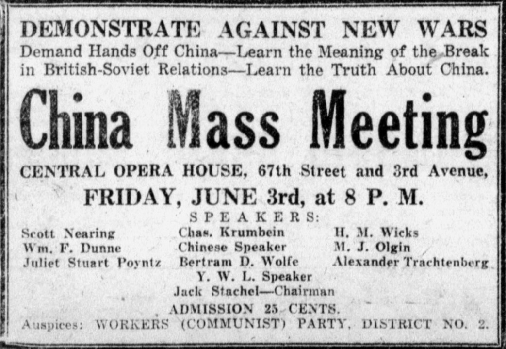 When told by Bertram D. Wolfe, director of the Workers’ School, the principal speaker, that the most effective way of fighting for the protection of the Chinese Nationalist revolution and against imperialist intervention was by joining the Workers (Communist) Party, 47 workers signed application blanks for membership.