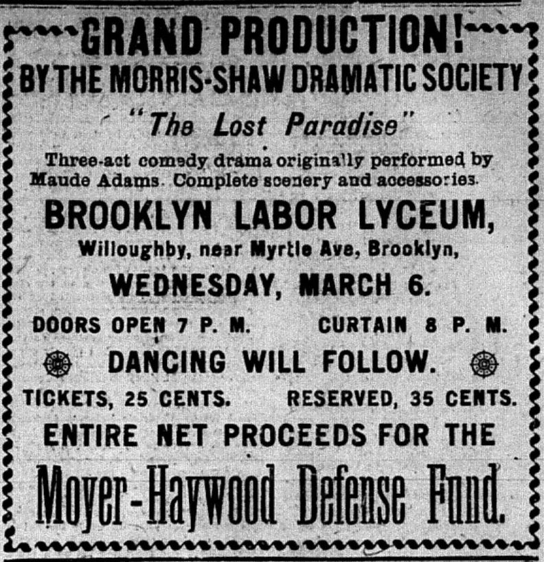 The production of “The Lost Paradise” by the Morris-Shaw Dramatic Society at the Brooklyn Labor Lyceum on Wednesday, Mar. 6, will be in aid of the Moyer-Haywood Defense Fund. The play will be given a high-class production. Leighton Baker, who has had some twenty years practical stage experience, has been of great help in staging the play.