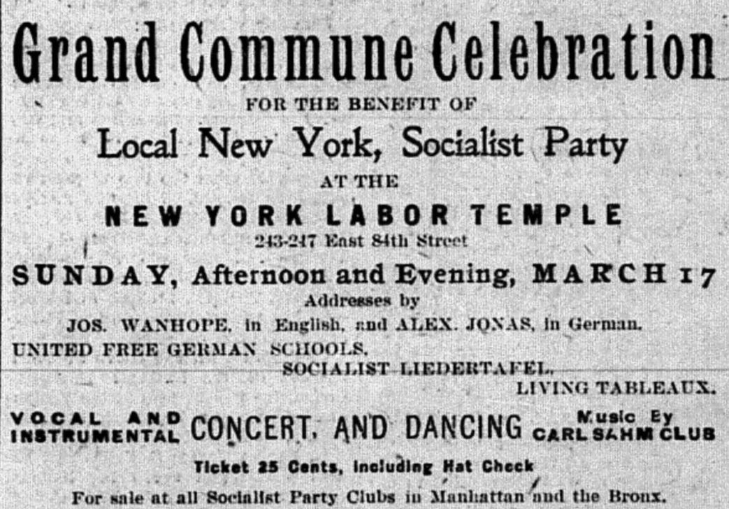 All arrangements for the Commune Celebration of Local New York are Low complete. In addition to the great number of talent already announced, the Executive Committee has secured the co-operation of the Finnish Socialist Mixed Chorus for a few revolutionary songs and the services of the Dramatic Section of the Labor Temple for living tableaux representing Rouget de L’Isle singing for the first time “The Marseillaise”. This is the first time in many years that Local New York has decided to celebrate the Commune, and it is a foregone conclusion that if this celebration is a success the local will celebrate the Commune in a similar way, probably in a larger hall, every year. Tickets have been sent to all the party organizations in the city and the comrades are requested to begin hustling and dispose of them, so that a large attendance may be assured.