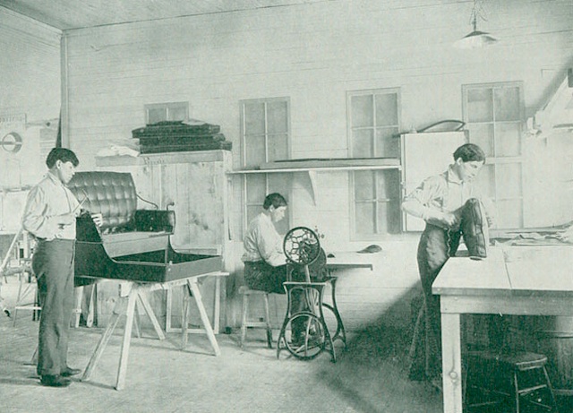With the rapid growth of cities under capitalism came a great demand for upholstered furniture, a demand that exceeded the supply. As mechanics were scarce, various schemes were tried to supply that demand. The undoing of the upholsterer was begun at this period. Apprentices were taken on in large numbers and bound to serve three years as such, with little compensation, generally none at all, the manufacturer settling with the parents for one hundred dollars at the expiration of the apprenticeship. With the emigration from other coutries, men paid the manufacturers to learn the trade. That generation of upholsterers and the one following almost lost track of their origin, while the present generation knows nothing of it at all, and the ones entering now will be nothing more nor less than a machine or section hand. Such is the rapid development of the industry under capitalism. With the advent of the apprentices first mentioned, and in the subdivision of labor that took place along with it, the demand of society was satisfied for the time being, as upholstered furniture is a luxury. Then the manufacturer had to devise ways and means to create a new demand for his goods, which consisted mainly of plain work. It was then that tufted work was introduced on a large scale–though tufting on a small scale in the manufacture of upholstered furniture by hand had been in use for over two hundred years-and consisted of the filling and retaining of materials in variously shaped designs (commonly called biscuit and diamond tufting, and consisting of filling such designs with various materials, and the laying of plaits in fabric to be tufted, and of securing such fabric to a suitable backing).