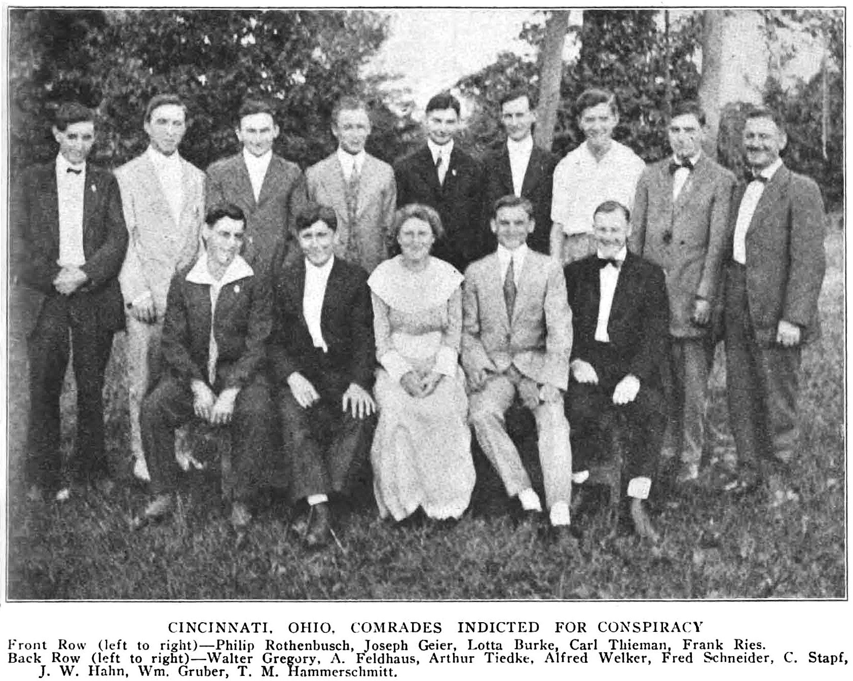 On June 1, 1917 Socialists in Cincinnati were distributing anti-war/anti-draft leaflets in Clifton Heights when arrested by the Feds and charged with drat obstruction and treason. Among those arrested was the most prominent local Socialist militant, Lotta Burke, (who would go on to become a founder and central leader in the Communist Labor Party), as well as other Left Wingers. Their trials, which included time in jails, loss of jobs, harassment, etc., lasted for seven long before getting to the U.S. Supreme Court where charges were dismissed on a technicality. Respect and gratitude to the Cincinnati 13 (3 others had charges dropped). Here are brief biographies of these heroic comrades.