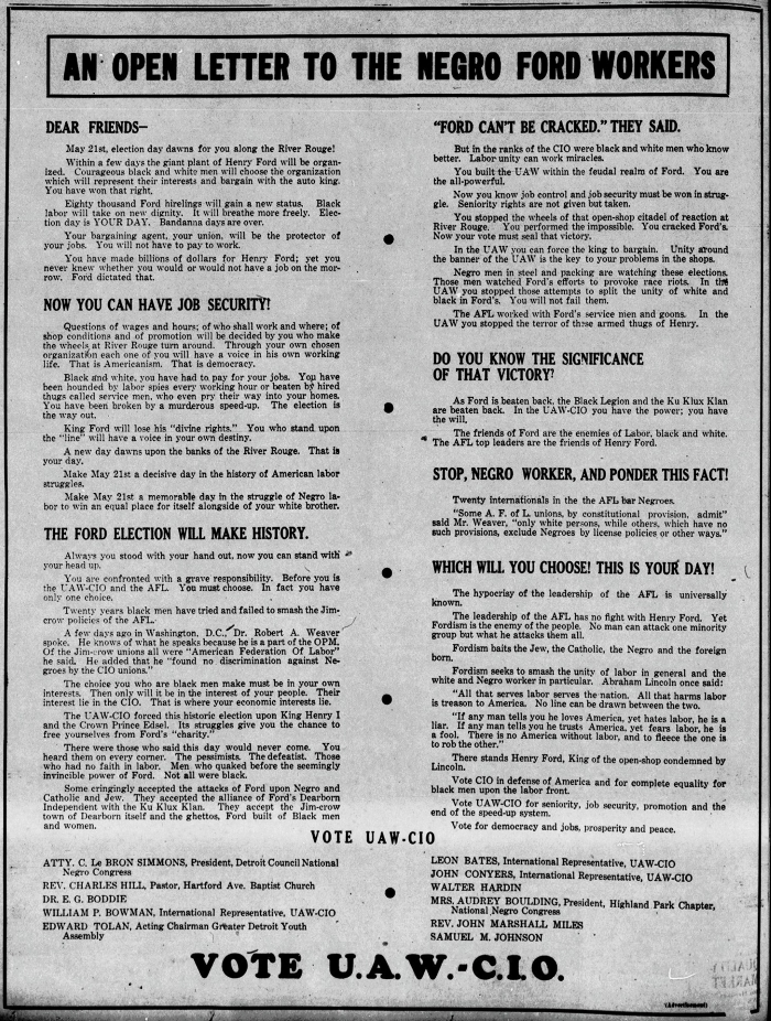Ford, vehemently anti-union, was the last auto-maker to fall to the C.I.O., in part because of the racial politics employed by ‘King Henry.’ It took a dramatic shift to Black workers for the U.A.W. to win there. Just one month after this article was written, a victorious strike brought the union to Ford through the decisive support of Black leaders and enough workers to break through; one of the most important victories for the U.S. working class in its history.