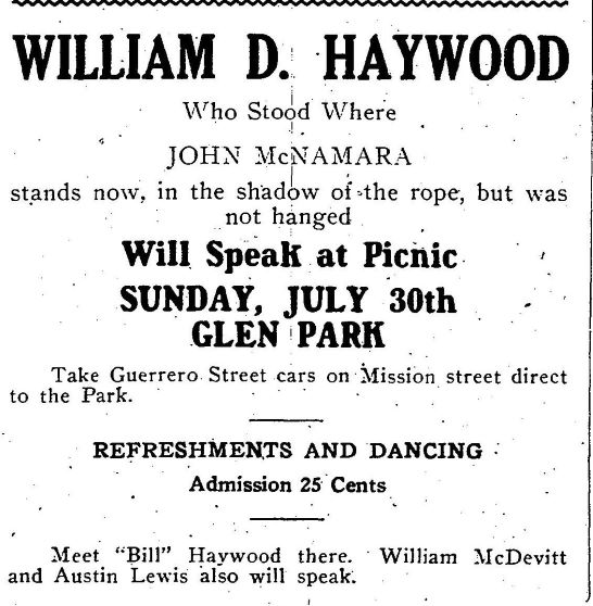 Haywood’s coming to California is opportune. The Socialist Party here seems to be afraid of its shadow; of its very name; of its own voice—that is, afraid of itself. Trying to make itself pleasing to itself, for the sake of pleasing its enemies, it has bit off its own head. its tail, coughed up its entrails, sun-dried and sugar-coated them, then swallowed them with the oldest and shrewdest political adventures in California officiating at the delectable ceremony.