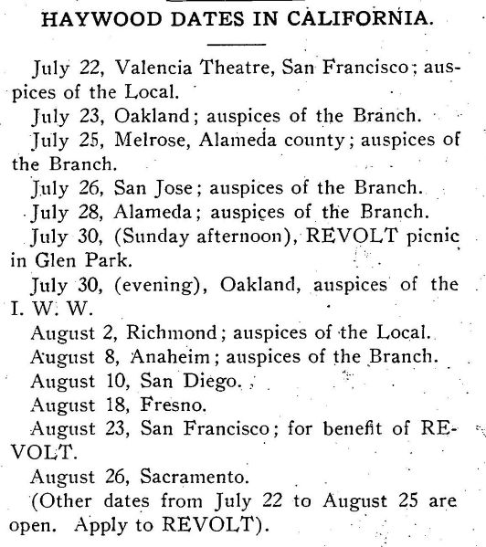 PACKED halls; aroused audiences; warm greetings, clamorings for more dates; long and enthusiastic after discussions among near, far and clear Socialists, craft unionists and industrialists, onlookers and sympathizers; a painstaking, apathetic labor press and a scrupulously silent capitalist press; all rebels alert and alive, smiling, watching, daring and doing; honest minded craft, unionists sharply listening and going home asking themselves questions—straws these that point the meaning of Haywood’s meetings in California.