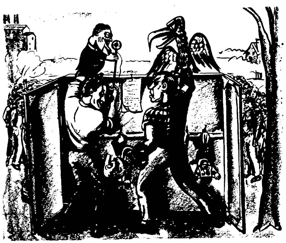 ON Tuesday, October 2nd, President Roosevelt, Madame Perkins and Bill Green addressed the workers on the corner of Tenth Street and Second Avenue, New York City. The Blue Eagle was there too, perched on F.D.’s shoulder. But they were not received with patriotic approval as shown in the newsreels. In fact they were enthusiastically booed, hissed and laughed at by a large and growing crowd. A puzzled cop stood by rubbing his thick neck in bewilderment. No police regulations covered this situation. Better go to the call box and find out what the Captain has to say. But look! Look what those guys are up to now! Roosevelt dancing with the Blue Eagle! Bill Green singing as he dances with Fanny Perkins: