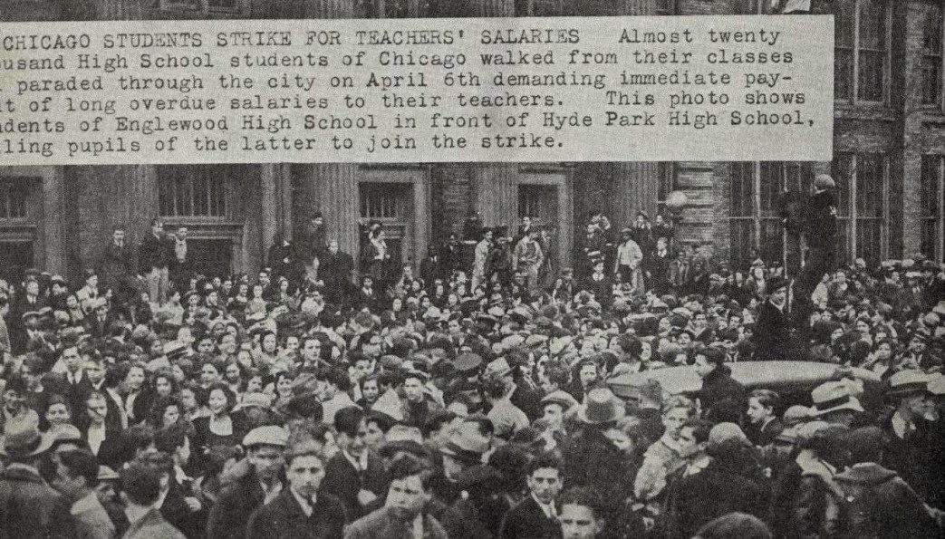 Militant students, militant teachers. Chicago has a long, honorable history of working class education struggle. In April, 1933 students take the lead in a strike that will involve thousands of teachers marching in support. The full story below.