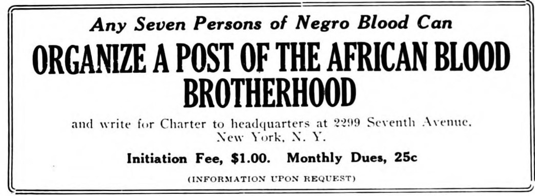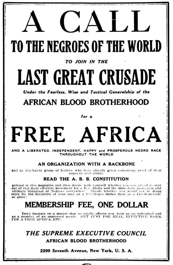 A race without a program is like a ship at sea without a rudder. It is absolutely at the mercy of the elements. It is buffeted hither and thither and in a storm is bound to flounder. It is in such a plight as this that the Negro race has drifted for the past fifty years and more. Rarely ever did it know exactly what it was seeking and never once did it formulate any intelligent and workable plan of getting what it was seeking, even in the rare instances when it did know what it wanted. It is to meet this unfortunate condition and to supply a rudder for the Negro ship of State — a definite directive force — that the following program adopted by the African Blood Brotherhood is herewith offered for the consideration of other Negro organizations and of the race in general.
