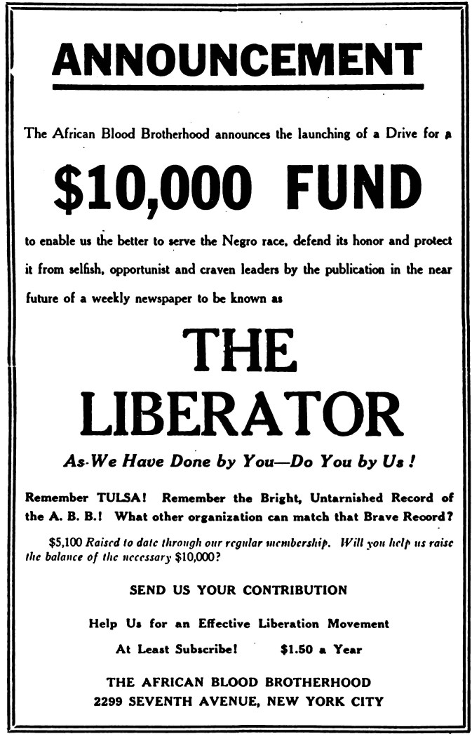 The Crusader was published in New York City between 1918 and 1922, becoming the paper of the The African Blood Brotherhood for African Liberation and Redemption and the earliest Black Communist publication in the US. Founded by Cyril V Briggs, who had arrived to the city from the Caribbean in 1905, at first it was the journal of the Hamitic League of the World, a Pan-African group led by George Well Parker. Increasingly in sympathy with the Russian Revolution and new Communist International, in October 1919 the paper announced the African Blood Brotherhood and its adherence to Marxism. In June 1921, The Crusader officially became the journal of the ABB and the Black publication of the US Communist movement. Antipathy with Marcus Garvey’s movement led the Communist Party, at the insistence of Claude McKay, to withdraw support and Its last issue was in January, 1922. The African Blood Brotherhood with dissolve into the Workers Party of America with many activists joining the American Negro Labor Congress in 1925.