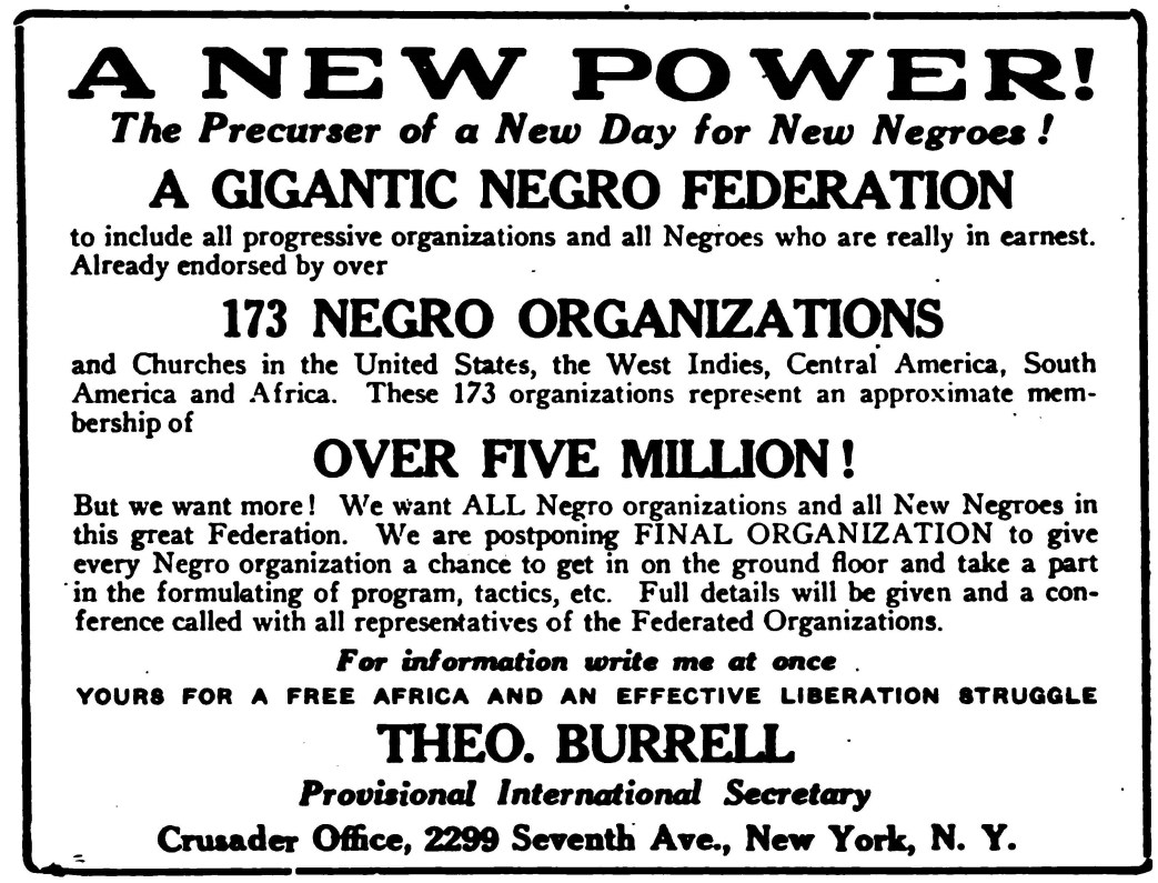 Millions of Negroes have come North and are employed as laborers and mechanics, etc., in the various industries and capitalist enterprises of the North. Being unorganized, they are compelled to work at the meanest jobs and under the worst conditions. When depression in industry appears they are the first to suffer. The white workers, through their labor organizations, have not only compelled the capitalists to give them more money and a shorter workday, but also partial employment during slack times. And when better times arrive, the white workers, through their organization, are ready to take full advantage of the situation. Negro workers, whenever organized in Labor Unions, have improved their living conditions, won shorter hours, more money, and steadier employment, as witness the sleeping car conditions, the Negro Longshoremen of Philadelphia, etc. And since the strength of a people depends upon the degree of well-living by that people, we must by all means strive to substantially improve the standard of living, etc. All worthwhile Negro organizations and all New Negroes must therefore interest themselves in the organizing of Negro workers into Labor Unions for the betterment of their economic condition and to act in close cooperation with the class-conscious white workers for the benefit of both.