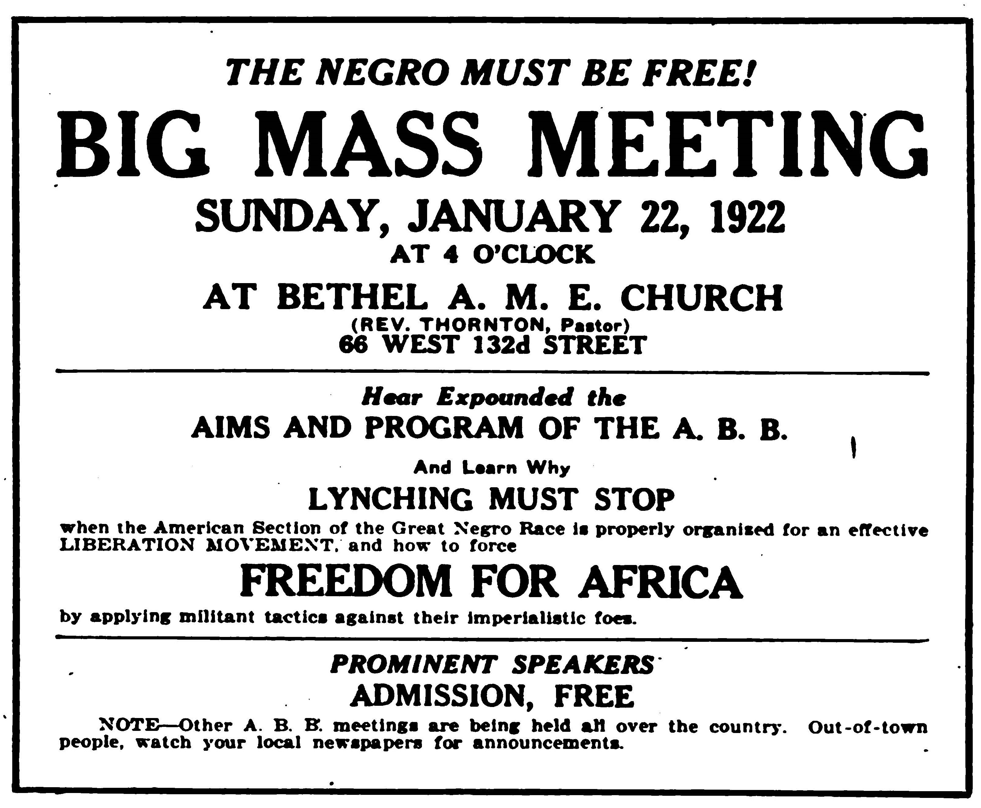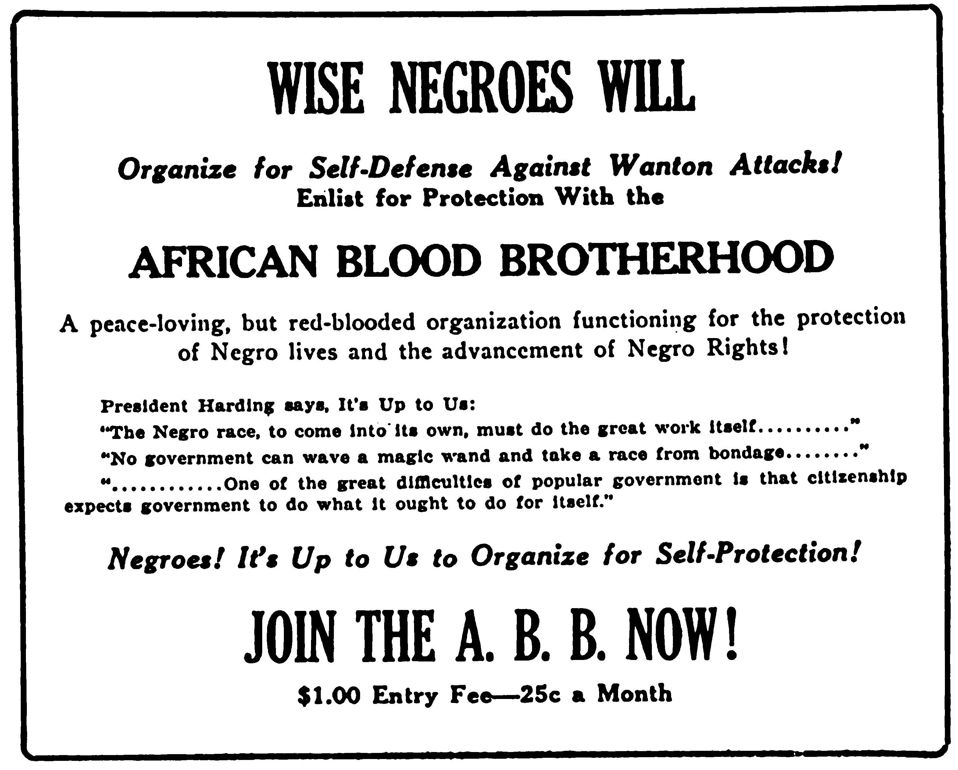 A race without a program is like a ship at sea without a rudder. It is absolutely at the mercy of the elements. It is buffeted hither and thither and in a storm is bound to flounder. It is in such a plight as this that the Negro race has drifted for the past fifty years and more. Rarely ever did it know exactly what it was seeking and never once did it formulate any intelligent and workable plan of getting what it was seeking, even in the rare instances when it did know what it wanted. It is to meet this unfortunate condition and to supply a rudder for the Negro ship of State — a definite directive force — that the following program adopted by the African Blood Brotherhood is herewith offered for the consideration of other Negro organizations and of the race in general.