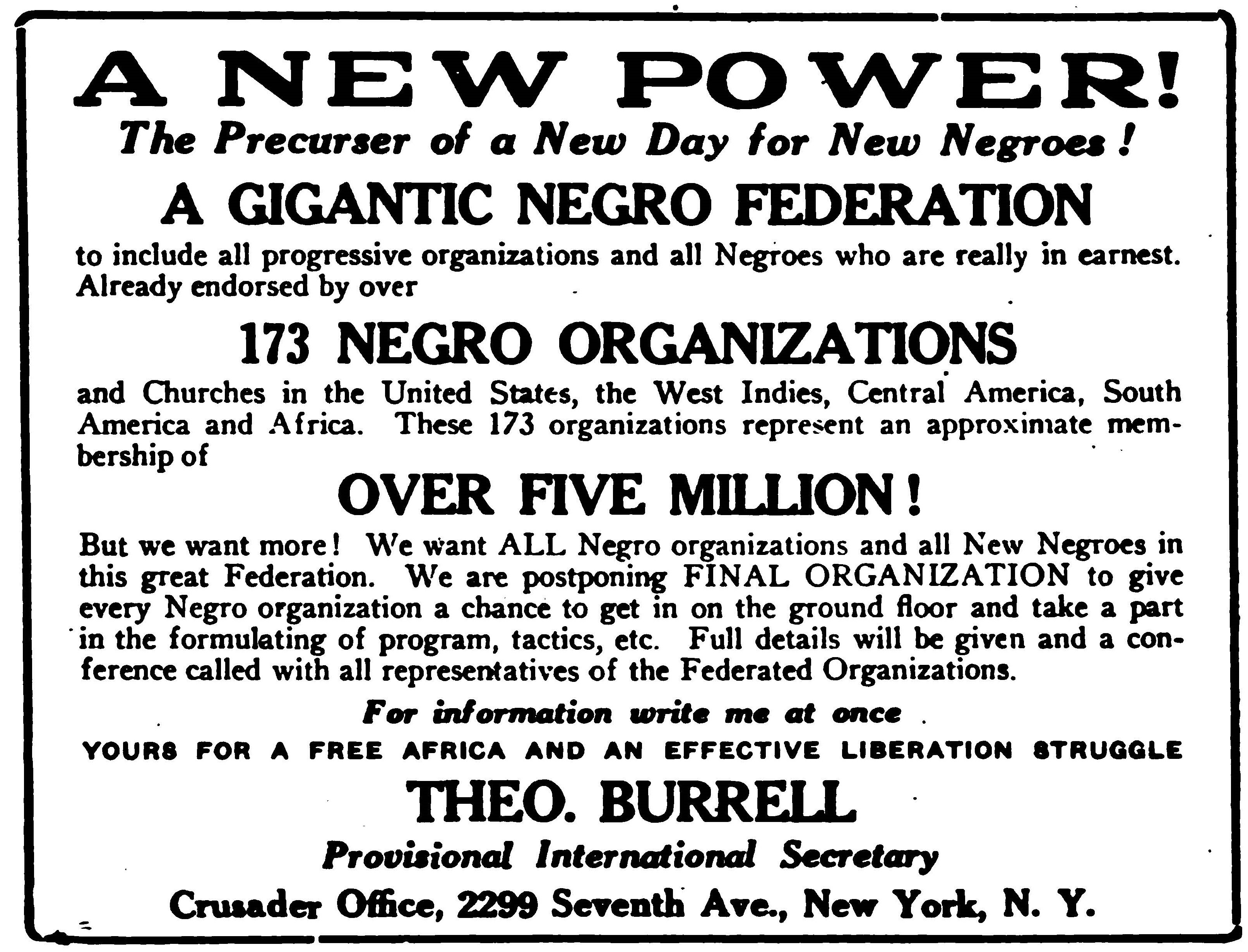 Millions of Negroes have come North and are employed as laborers and mechanics, etc., in the various industries and capitalist enterprises of the North. Being unorganized, they are compelled to work at the meanest jobs and under the worst conditions. When depression in industry appears they are the first to suffer. The white workers, through their labor organizations, have not only compelled the capitalists to give them more money and a shorter workday, but also partial employment during slack times. And when better times arrive, the white workers, through their organization, are ready to take full advantage of the situation. Negro workers, whenever organized in Labor Unions, have improved their living conditions, won shorter hours, more money, and steadier employment, as witness the sleeping car conditions, the Negro Longshoremen of Philadelphia, etc. And since the strength of a people depends upon the degree of well-living by that people, we must by all means strive to substantially improve the standard of living, etc. All worthwhile Negro organizations and all New Negroes must therefore interest themselves in the organizing of Negro workers into Labor Unions for the betterment of their economic condition and to act in close cooperation with the class-conscious white workers for the benefit of both.