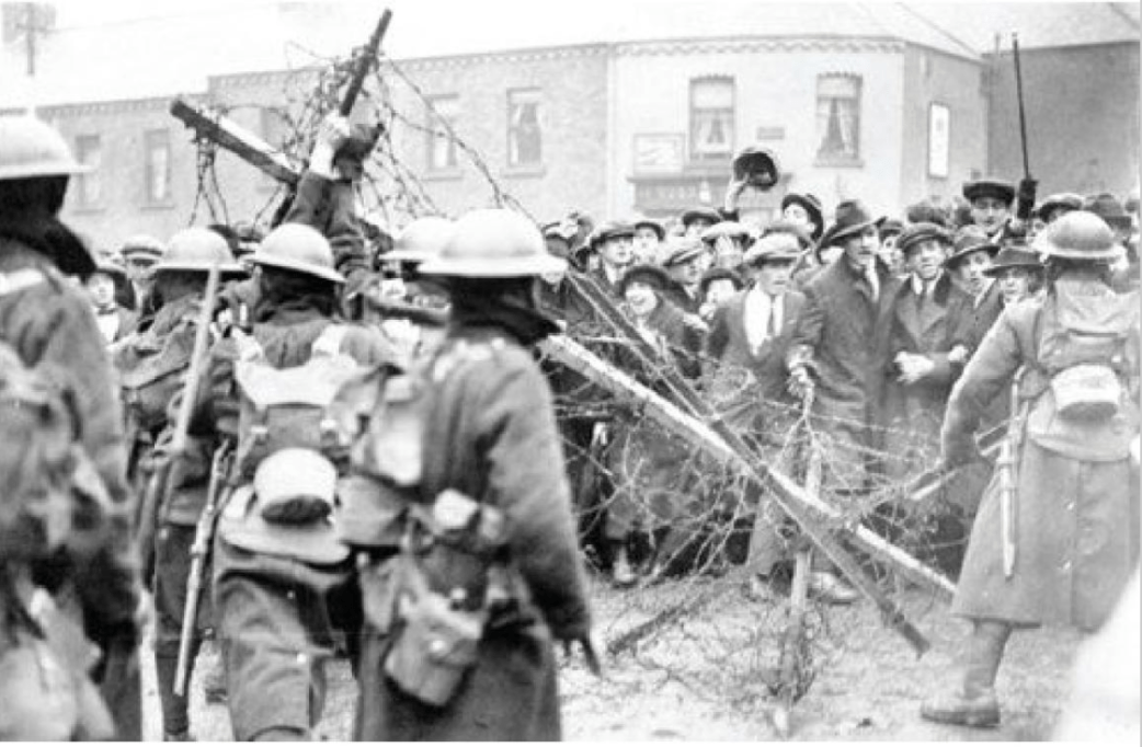 As luck would have it, the strike was declared on the very day of Punchestown Races, the greatest racing day of the year, as important in Ireland as the Derby and Grand National in England. Dublin was packed with visitors, the hotels full to overflowing. The bourgeoisie certainly learned the power of the workers, when the staffs down to the messenger boys turned out and left the quests to fend for themselves. Perhaps the most significant feature of the day was the display made by the Post Office officials, who marched a thousand strong through the city, calling at the various offices to take out the more timid members who, through fear or want of sympathy, had remained at their posts.