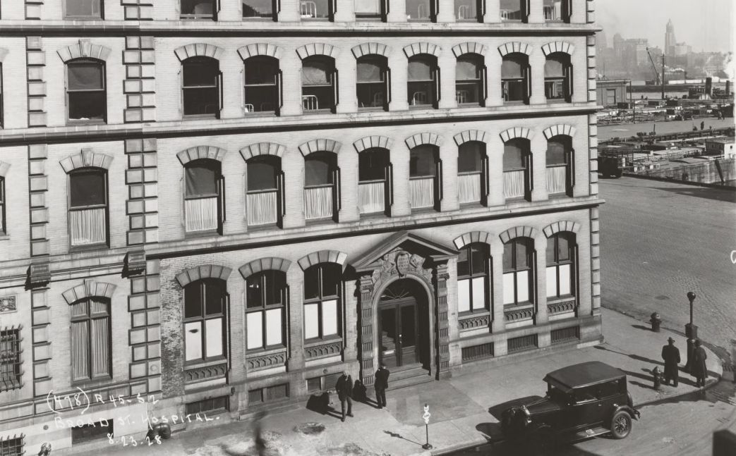 The Broad Street hospital is at the junction of Broad and South Sts., at the East River waterfront. It serves a district in which thousands of longshoremen work and which at the same time includes the Wall Street financial section. It serves also the dismal living quarters of Washington St., screened from the eyes of big business by skyscrapers.