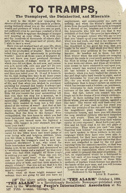‘A Word to Tramps: The Unemployed, the Disinherited, the Miserable’ by Lucy E. Parsons from The Alarm (Chicago). Vol. 1 No. 1. October 4, 1884.
