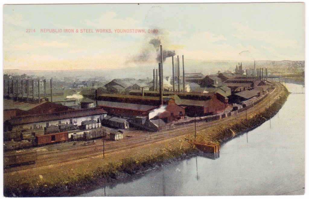 To get a view of Youngstown fixed in your imagination, conceive on the horizon fifteen miles distant a dark and ugly cloud. If it is night, this cloud is illuminated by flashes of fire. You come closer and at last into the clouds–you are among the suburbs of this workshop of 110,000 inhabitants. On one side the mills of The Youngstown Sheet & Tube Company occupy exactly four miles of the Valley of the Mahoning River. Above it is the Republic Iron & Steel Company. On the other side are hundreds of acres of dingy shacks. You conclude at once that they are the cheapest and meanest habitations occupied by human beings in the whole world.