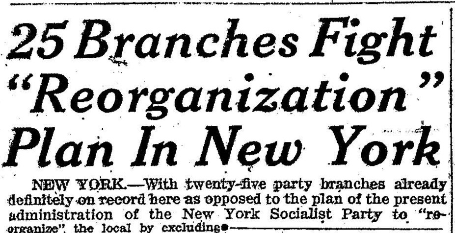The process of rebirth and revival was made necessary by the action of a small, autocratic faction within the party which tried to set aside Socialist principles that it might keep the party small and sectarian to be used in political deals with old line labor politicians of the old parties. Hampered in their move by the resentment of the active membership, who saw in the Socialist Party a weapon for working class action, the faction group in control of the old City Central Committee proposed “reorganization” of the party two weeks ago a proposal which meant the ousting from Socialist ranks of all left wing and progressive elements.