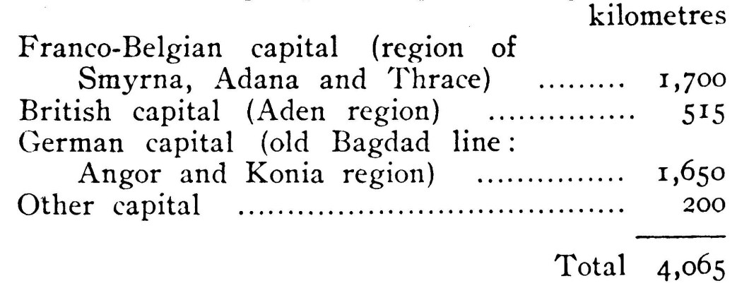 The Kemalists were quick in realising the importance of railways for the proper modern exploitation of the country. They also soon grasped that without dominating the railway lines one cannot aspire to predominant influence on national economy. Therefore they paid from the very start special attention to the question of transport. One can truly say that up till now the pivot of the policy of Ismet Pasha’s Cabinets has been his railway and public works policy. We give below a table illustrating the distribution of the railways of Turkey between the various groups of imperialist capitalists.