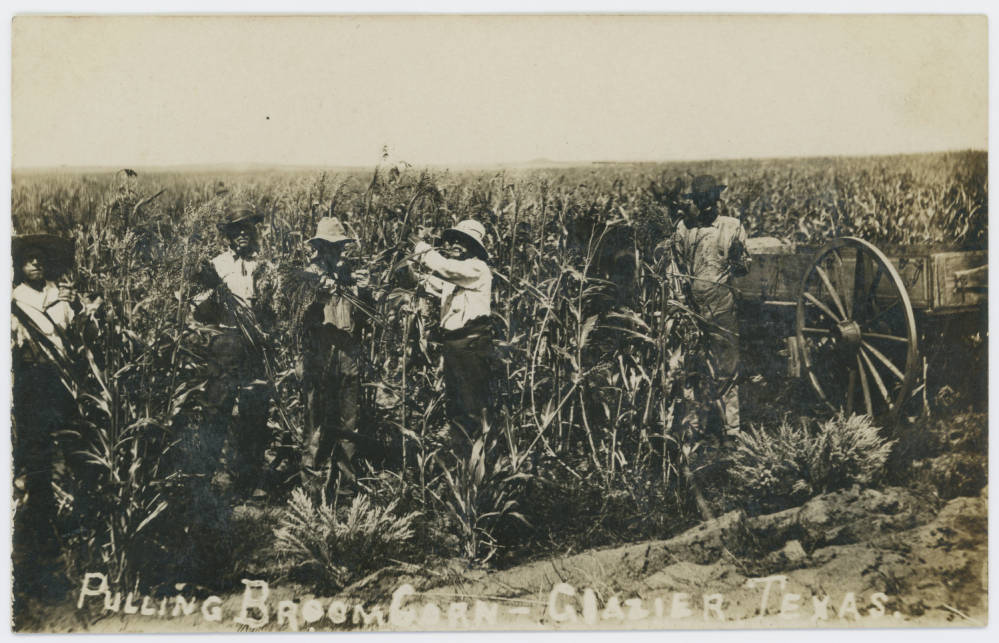 Dwarf broom corn is harvested by “pulling” or “jerking.” To do this the “brush” is grasped in one hand and the top leaf or “boot” in the other and the “brush” extracted by pulling outward and downward. The “brush” is then laid on the ground, or on broom corn stalks broken down for that purpose, being later loaded on wagons and hauled out of the field. The methods of harvesting standard broom corn are similar to those employed in harvesting the dwarf variety, with the exception that the stalks must be “cut” or “broke,” this being necessary on account of its great height and because of other characteristics.