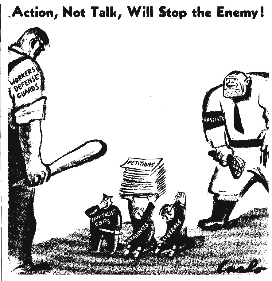5. The Workers Defense Guard is, from one point of view, an outgrowth and development of the picket squads used by virtually all unions in strikes. From the beginning, however, the Defense Guard differs in key respects from the picket squad. The Guard is permanent, whereas the picket squads are usually created only for the duration of the strike. The duties of the Guard are not merely picketing, defense against scabs, etc., but at all times the defense of the headquarters and rights of the union and its members. Moreover, the tasks of the Guard must be conceived, from the start, not in narrow terms of the given single union which may be first involved, but of the labor movement as a whole, and indeed of all groups, individuals, organizations, racial minorities, etc., threatened or attacked by the fascists, vigilantes or other reactionaries. The duty of the Guard is to defend all who need defense from the assaults of the fascists. To carry out this duty, the Guard must be trained and disciplined, and function democratically as an autonomous body. From a second point of view, the Workers Defense Guard is the preparation for the far broader organization of the masses, with far greater tasks, which will in the future have the task of defending the masses against the counterrevolution.
