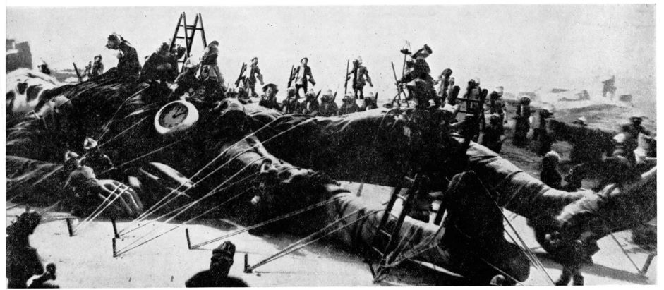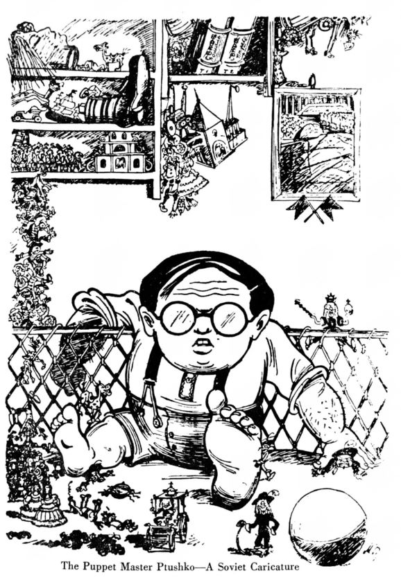 Now let us describe what this collective did to warrant the confidence of the government. The film The New Gulliver was made with thousands of puppets and one human being. The story is based on Swift’s Gulliver’s Travels. But by having the young pioneer, Petya, dream that he was Gulliver, the director Ptushko was able to take liberties with Swift’s story and make a perfectly conceived marionette movie. In Petya’s dream, Gulliver sees the land of the Lilliputs through the eyes of a pioneer, and the childish confusion of ancient costume and people with modern machinery is very logical and charming.