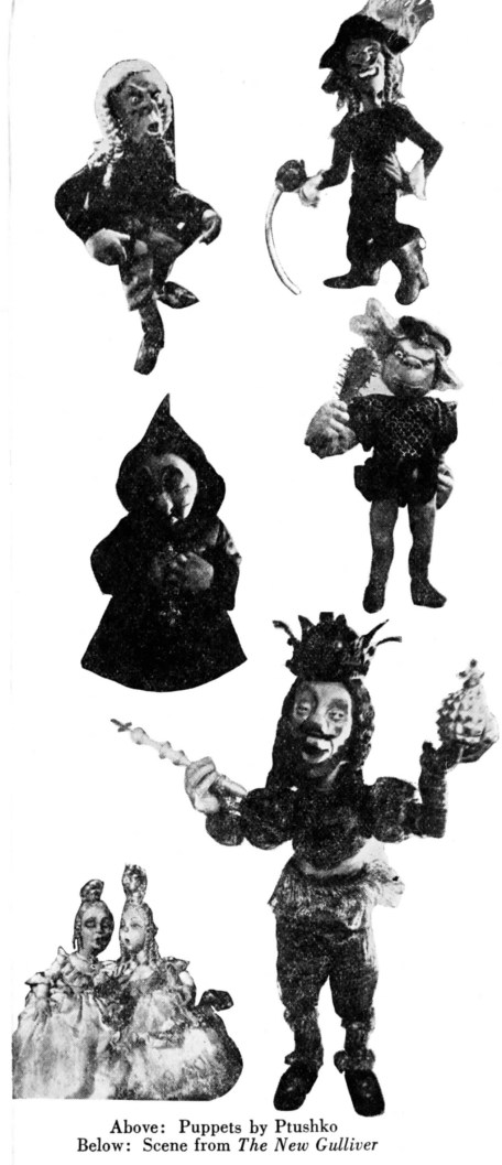 The New Gulliver is in its fourth week at the Cameo as this article goes to press. The film has already been reviewed by every metropolitan paper and magazine that carries cultural and feature news, and the reviewers have elbowed each other in the rush to attain heights of praise. Some of them have even warned Clark Gable and Mickey Mouse to look to their laurels. One said that Gordon Craig was right: “The puppet is an ueber mensch, and the world’s greatest actor.” True, most of them objected to the “underlying propaganda” in New Gulliver’s brilliant technical achievement, but they hinted that Hollywood could correct this defect in future American puppet films. None of the reviewers even suspected that this film carried a profoundly disturbing message to the surprisingly large number of American workers in the puppet field. This article will explain the nature of the disturbance.