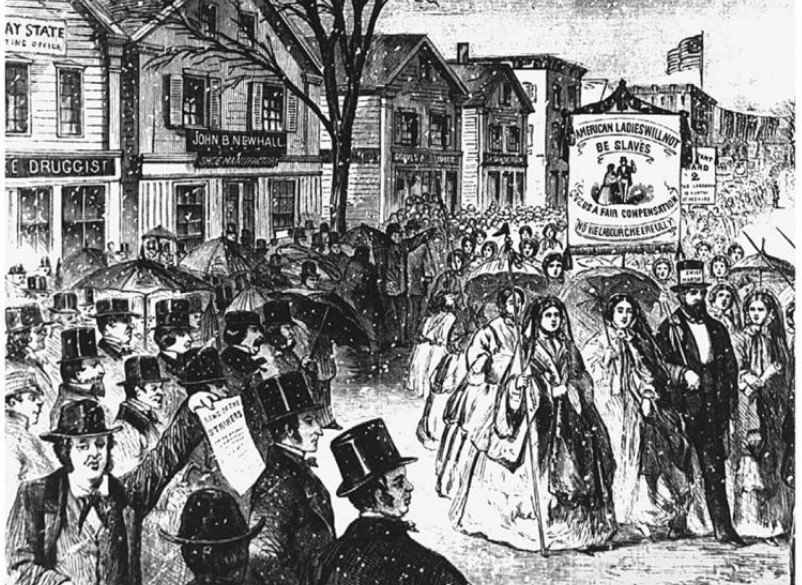 A most interesting strike, involving several hundred women shoe stitchers of Lynn, Mass., occurred during February and March, 1860. During a snow storm one day in March 5,000 men and 1,000 women formed a grand procession and marched with music and banners through the streets of the town. At once 100 special policemen were appointed and a detachment of police was sent from Boston, but as there was no rioting and as the people “only walked,” these historic upholders of the employers’ interpretation of law and order wisely withdrew.