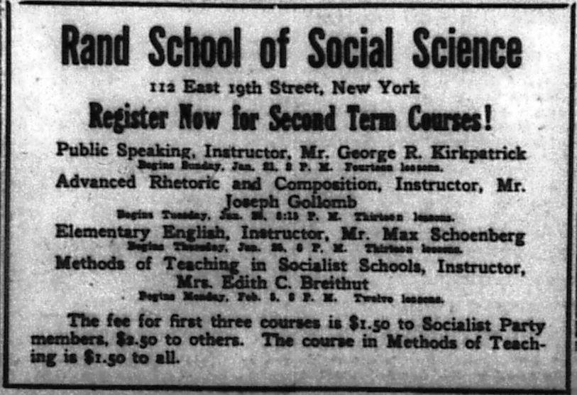 The Rand School Extension Class in Socialism and Public Speaking under the direction of George R. Kirkpatrick, will meet as usual tomorrow morning at 19 o’clock at 22 Rutgers street.