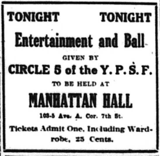 The sixth annual entertainment and ball of Circle, of the Y.P.S.F. will take place tonight at Manhattan Hall, 103-05 Avenue A. The following is the program, in part: Short talk by Bertha M. Fraser: piano solo by Miss Kontrowitz: recitation by Miss Schackmon: duet, “Sonata” by Miss Ira Kontrowitz and Mr. Shenkof; violin solo by Miss Ginsburg, and last, but not least, the world’s wonder mimic, August Claessens. Tickets admitting one, including wardrobe, are 25 cents.