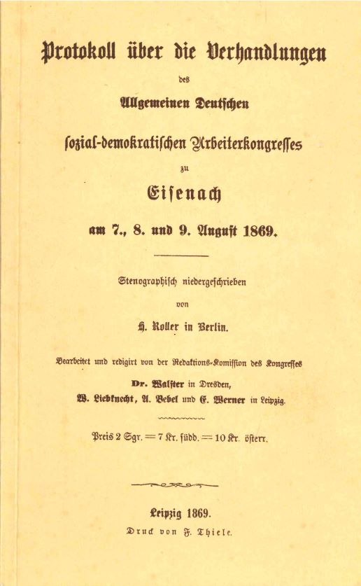 Reserving it for another time, to sketch for my American brethren a succinct history of the Socialist-Democratic movement in Germany, I will today lay before them the Eisenach Program, on which our party has taken its stand, and from which it is generally named “the party of the Eisenachers.” Eisenach, a little town situated in the heart of Thuringia, is one of the prettiest spots in this province, so rich in picturesque scenery; down on it looks the proud Wartburg, where in the twelfth century the half mythical “war of the Minnesänger” (Troubadours), known as the Sängerkrieg, took place, and where four centuries later Euther sheltered himself from the persecution of Emperor Charles the Fifth, and finished that grand monument of the German language, his translation of the Bible. Here, amidst soul-stirring and mind-elevating reminiscences of that past, there assembled in the first week of August, 1869, more than two hundred delegates, chosen by the workingmen in all parts of Germany; Prussia, Austria, Württemberg, Saxony, Bavaria, Hessen and the other divisions of our still much divided Fatherland, had sent their contingents and delegates, some from the banks of the Rhine, the Danube, the Maine, the Elbe and the Oder, from the Baltic Sea and the German ocean, from the foot of the Alps and the Lowlands of the North, represented “German unity” far better than the “North German Reichstag” did, of which half of Germany was excluded, and better too than the new “German Reichstag” will do, of which one third of Germany–German Austria is excluded. An attempt made by a body of people in the pay of the Prussian Government, to frustrate the deliberations, was speedily put down; the Congress went to work with a right good will, and agreed, after long and conscientious debates, about the following program, the principal authors of which, by the by, are now, hardly without an exception, in prison–a fact illustrative of the political condition of my native country, and warmly to be recommended to the attention of those strange republicans who are in love with our “New (Bismarckian) Era.”