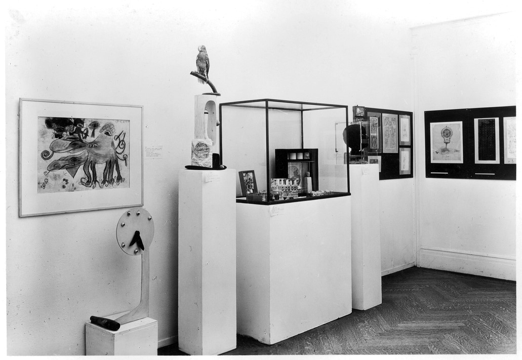 It is impossible in small space even to review this enormous collection of “art” objects of all times and of varied esthetic worth from fur-covered cups, zipper-eyed suede maidens, bearded grapes, mathematical objects, rotating glass machines, bird-cages filled with sugar, collages of all sorts, architectural photographs, prints, paintings and sculpture. A serious omission is the lack of photomontage–in particular, the work of John Heartfield–the one phase of modern fantastic art which has received universal approbation and has been incorporated in our everyday existence.