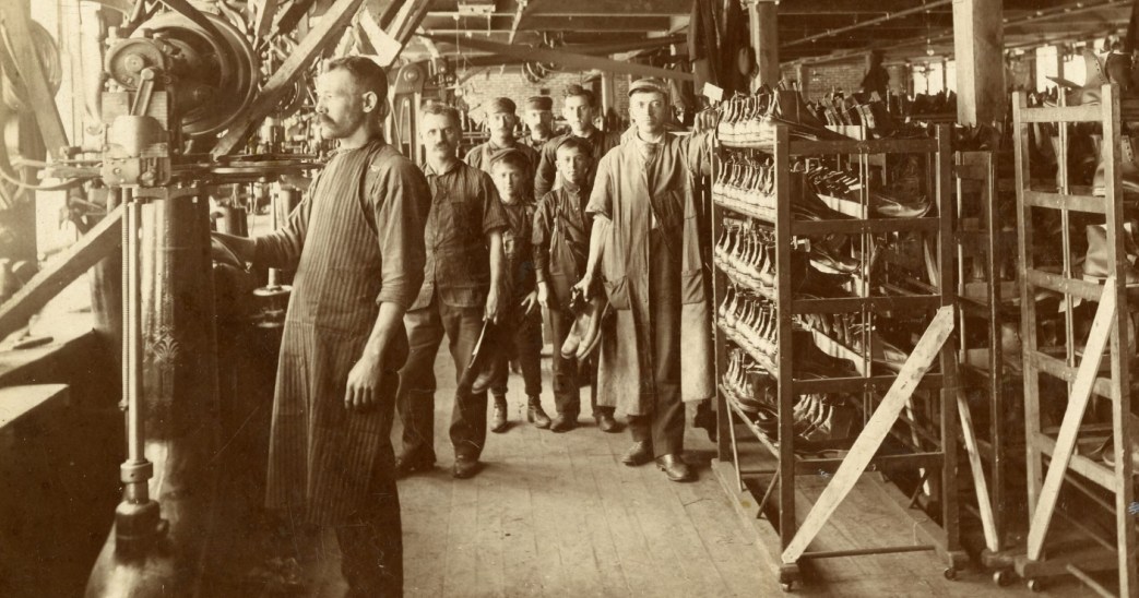 The Civil War and the impetus which machinery gave it caused the boot and shoe industry to move to the front ranks at a rapid rate, until today it is the means whereby nearly 250,000 persons earn their bread and the bread of those dependent upon them; and that portion of the capitalist class who own the tools by which boots and shoes are produced wax fat and export to other lands thousands of pairs of boots and shoes, while those who produce them go about on their “uppers,” constantly on the edge of poverty.
