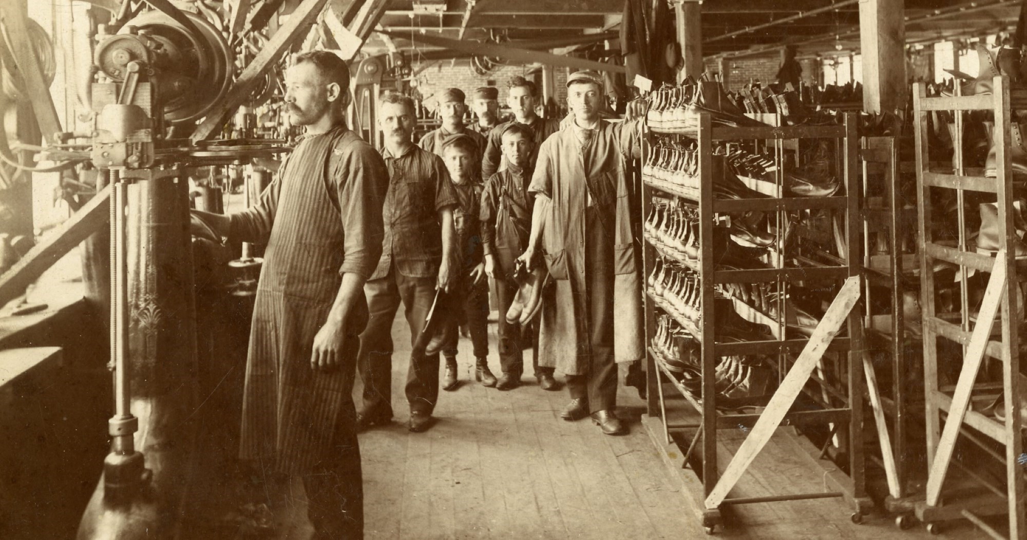 Prior to the ’50s the making of boots and shoes was “hand work” and was a leading occupation in Massachusetts and parts of New Hampshire and in certain cities in New York State. In those days the shoemaker worked at home, or in the old “ten-footer” of that period, where he hired “seat room.” Not only did the shoemaker work at the trade, but in many instances the entire family as well. The women assisted in the fitting of the upper, which was then done by hand, and the boys did odd jobs around the shop: But that day is no more. The hand worker, with his few crude tools and “ten-footer,” has passed away forever. His place has been taken by the modern shoe worker, the appendage of a highly developed tool, working in a mammoth factory, where hundreds, and in many instances thousands of “hands” are employed.
