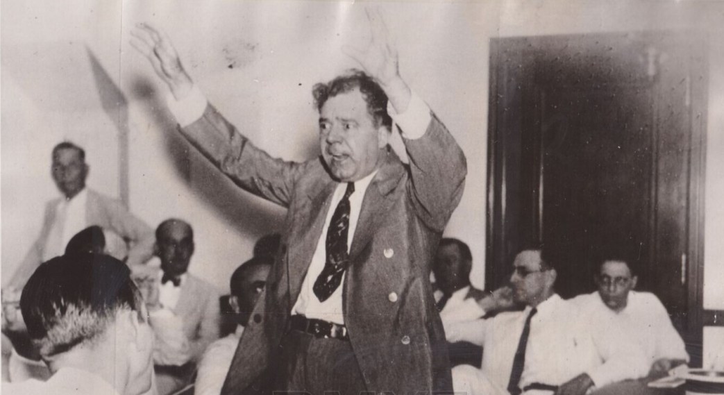 His feet are planted solidly on the platform. His cadenced sentences rise and fall over the entranced audience. The speaker’s face is pudgy, his cheeks flushed. His bulbous nose is red. There is a deep cleft in his forceful chin. His face appears wilful. He has the voice of a side-show barker, with the gestures of a Hitler.