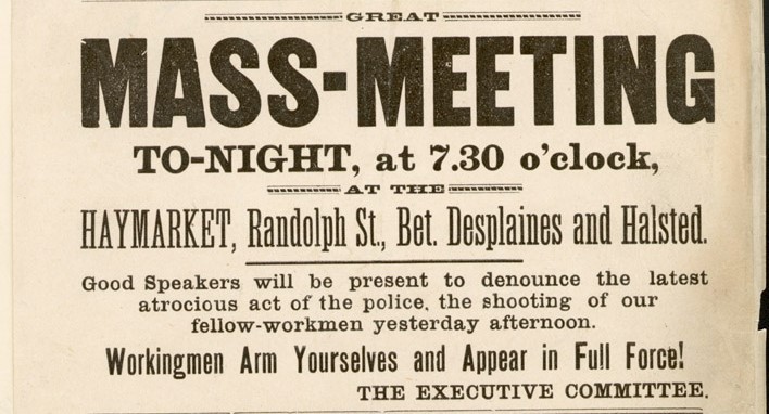 A piece of history on the road to Haymarket. As the May 1, 1886 general strike for the eight-hour day approaches, Chicago radicals gather to proclaim they will enforce the eight-hour day on May 1 regardless of law. The meeting is addressed by Paul Grottkau, August Spies, and Samuel Fielden among others.