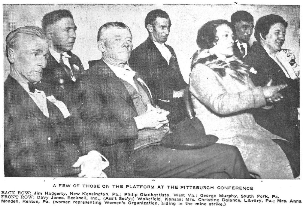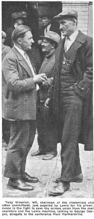 Stanley Dziengliewski from Pittston told of the Lewis-Cappellini program of murder and frame up there: when progressives win control of a union, gunmen kill three of them, wound another, and frame up three on murder charges, Tom Parry, of Illinois, expelled by Fishwick and Farrington; George Voyzey, counted out by Lewis when he ran for international president in 1924, Wakefield of Kansas, where Lewis expelled the officials for fighting the antistrike law; and many others of the rank and fife added their voice to the indictment of Lewis and his clique. Anthony Minerich, reporting as chairman of some of the most important committees, spoke again and again, militant, direct, common sense, he had just been expelled, Lewis’ first victim, for attending the conference.