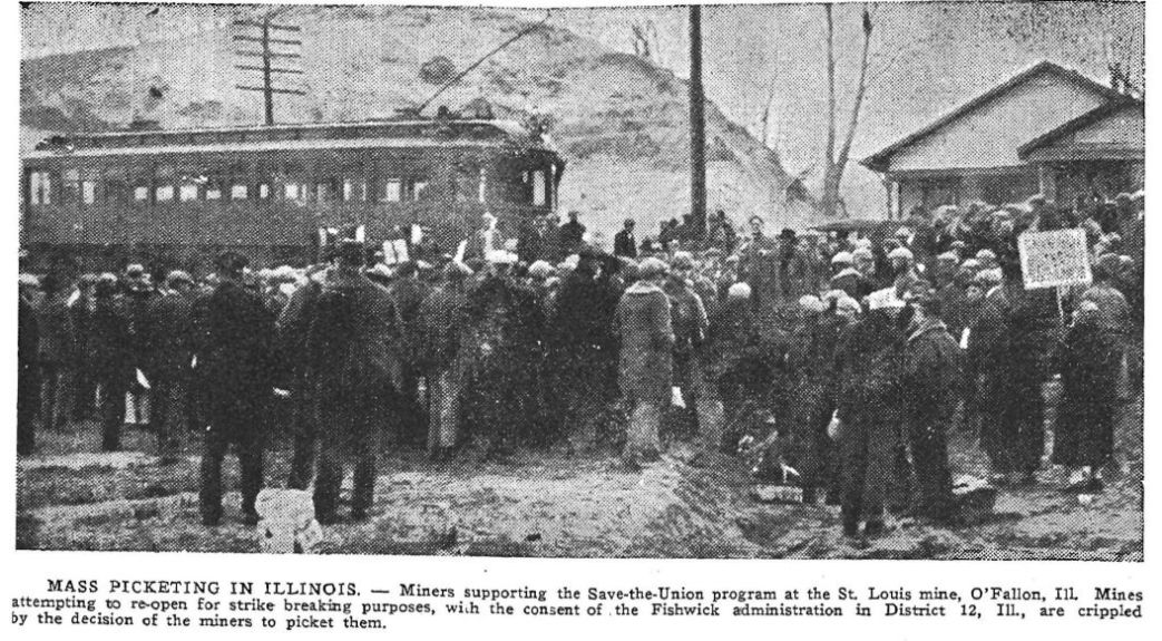 Then a call for mass picketing and mass violation of injunctions both of which policies the Lewis machine has sabotaged, and for strike on April 1 of Illinois, Indiana and Kansas, the districts forced to make a separate, strikebreaking peace with the operators by Lewis, and after that the call to the unorganized to join the strike: