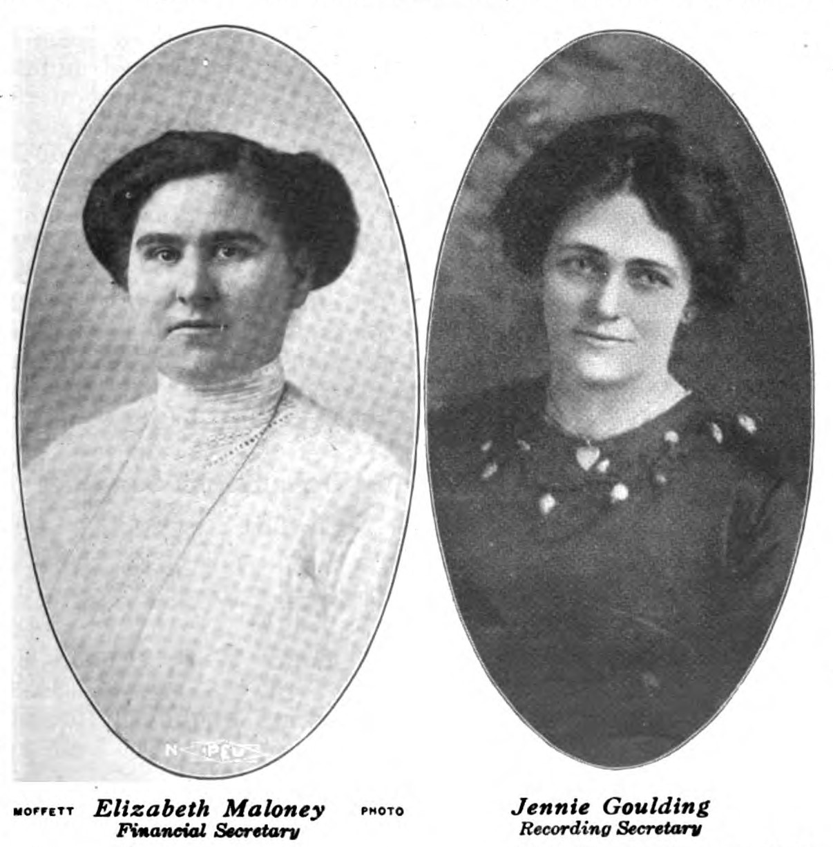 A union was formed on the spot, with Elizabeth Maloney as Secretary and Treasurer. She let no grass grow under her feet while enlarging this union, having overcome the difficulty of the many languages by giving her speech in English to an apt understudy, who gave it out again in French or Italian, as the occasion demanded, and with a friend of Miss Maloney conversant in the same language listening–just to keep tab.