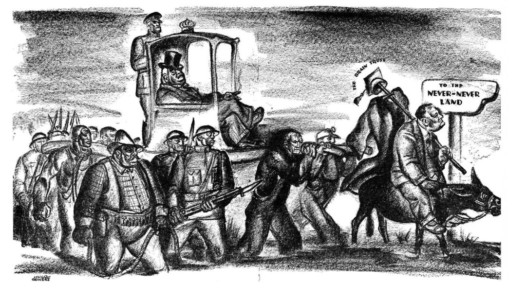 All the professors clustered around the throne, their brains bursting with blueprints for the Promethean task of planning production and distribution under capitalism, are writing voluminous paid-in-advance messages of hope and cheer for the American people. There is no unemployment and no want, no unpaid labor, in and around the White House.