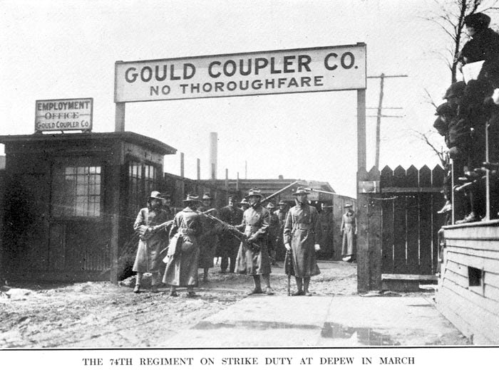 The trouble started about one o’clock yesterday morning when the men at the Cold Spring barn were ordered to move cars to the 74th armory to take a big crowd home from a dance being held by the regiment. When the men found that instead of taking dancers home they were to carry militiamen to the Gould plant they struck, on advice of the barn committeeman, Frank Riley, who had been routed out of bed to pass on the situation. He also consulted Clarence Conroy, business agent for the carmen who advised the men not to take cars out as the agreement with the company specifies clearly that the men are not to be compelled to work overtime or to carry any baggage on the cars. Both of these points were violated by the men in charge of the militia.