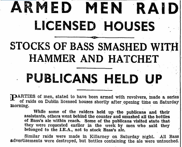 The “Boycott British” struggle is intensifying in the Irish Free State. Wholesale raids on beer houses selling English ale have occurred not only in Dublin, but in almost every part of Southern Ireland. In most cases supplies of Bass ale were destroyed and advertising material relating thereto seized or defaced. Over a score of arrests have taken place in connection with this struggle; the Fianna Fail Government is openly warning militant Republicans that the movement will be ruthlessly dealt with; while republican workers demonstrating outside Dublin courts in sympathy with their comrades on trial have been batoned down by de Valera’s police and dragged into the dock for daring to invade the sanctity of His Majesty’s Free State law.