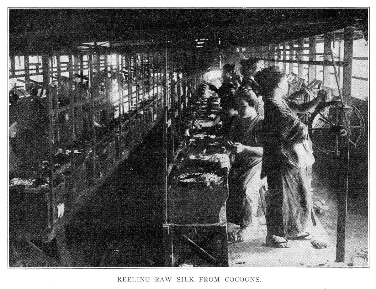 When the silk is to be dyed in the thread it goes to the dye-houses after it has been doubled and there is where the adulteration occurs. Of this more will be said later. From the dye-houses it goes into the silk mill and the winders wind it again from the skeins onto bobbins. Then the warpers make the warps from the bobbins and the weavers weave the warps into cloth.
