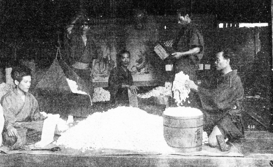 After sorting the cocoons they are subjected to an intense heat in order to kill the larva inside of them. With the aid of hot water the frail, thin threads are unraveled from the cocoons and wound into skeins. The silk in this state is full of gum from the cocoons and when next it goes into throwing plants, the skeins have to be soaked in hot water over night before they can be handled. The large amount of gum stiffens the silk when it is dry.