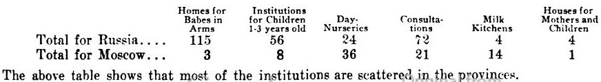 In addition, the work of instruction in hygiene has been directed very methodically along the line of combatting these social diseases, thus making the fight particularly against infantile tuberculosis and syphilis effective. Also, the protection of motherhood and infancy has attracted particular attention on the part of the Soviet Government. At present, the following institutions are available in Soviet Russia: