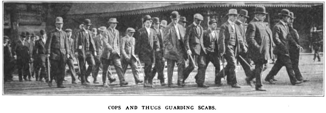 Consternation reigned among the politicians of the Democratic party. A labor dispute just before election would materially endanger their chances for victory. But when the conflicts occurred in the streets of New York and Jersey City, Mayor Gaynor allowed policemen to mount the express wagons and with drawn clubs they protected the strikebreakers. Up and down Broadway was seen the shameful spectacle of blue-coated officers diverted from their supposed task of keeping traffic orderly and protecting pedestrians, to their real mission of protecting private property for the class in whose services government is operating today. (A rather pointed lesson to “Home Rule” advocates and Irish Nationalists were these Irish police “scabbing’” on Irish strikers.)