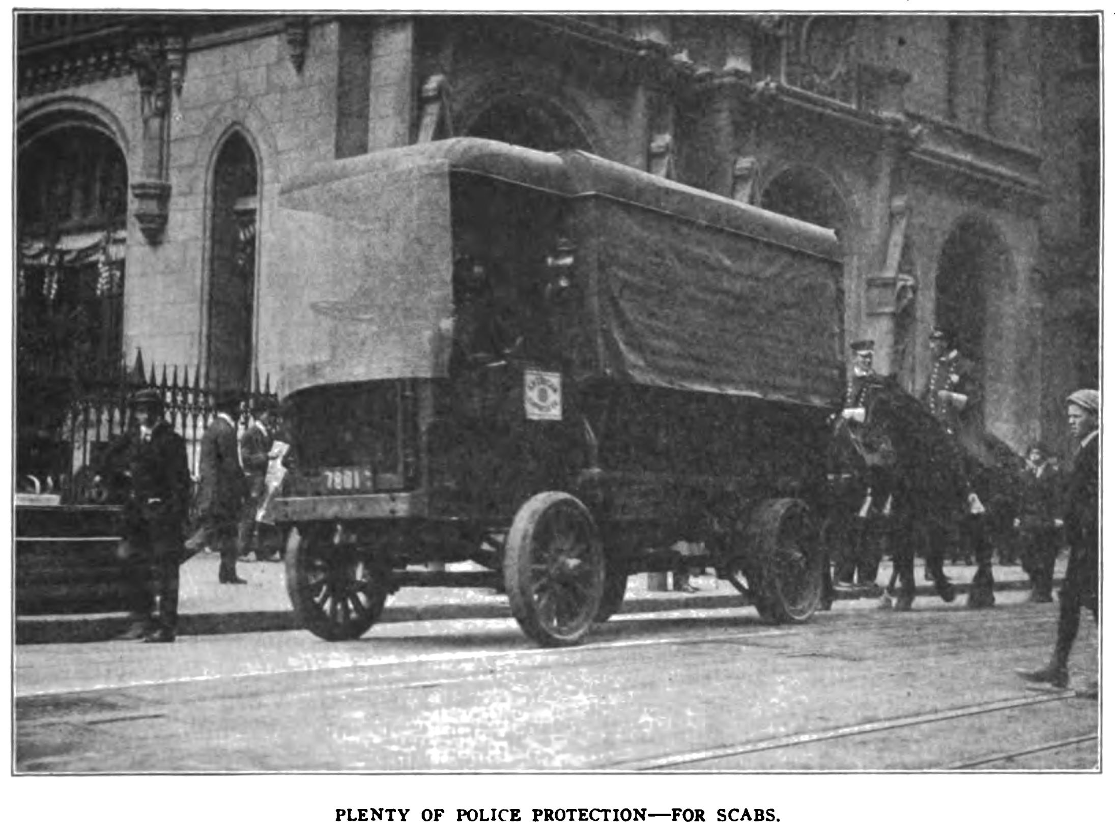 Consternation reigned among the politicians of the Democratic party. A labor dispute just before election would materially endanger their chances for victory. But when the conflicts occurred in the streets of New York and Jersey City, Mayor Gaynor allowed policemen to mount the express wagons and with drawn clubs they protected the strikebreakers. Up and down Broadway was seen the shameful spectacle of blue-coated officers diverted from their supposed task of keeping traffic orderly and protecting pedestrians, to their real mission of protecting private property for the class in whose services government is operating today. (A rather pointed lesson to “Home Rule” advocates and Irish Nationalists were these Irish police “scabbing’” on Irish strikers.)