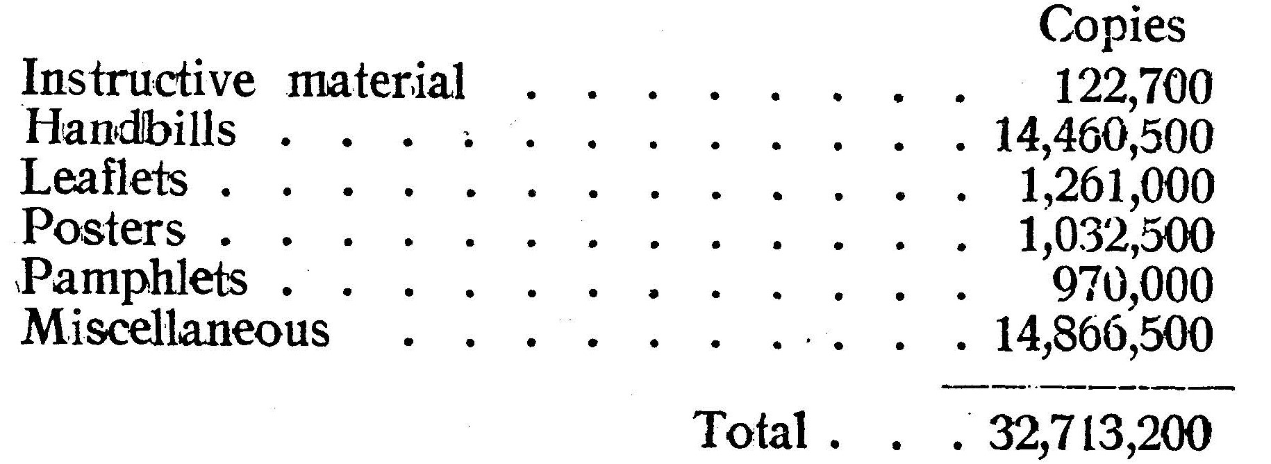 The work falling to the share of the Agitprop may now be classified under two main headings, these being again subdivided into various minor categories.