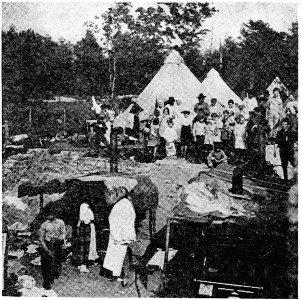 “I tell you, young man,” said a tall, raw-boned wife of a miner who was trying to get dinner on a cook-stove in a leaky tent and at the same time keep four small children in order, “it’s no fun keeping house in one of these here army tents. But if you aim to write a piece about all this, you put it down that we ain’t going back. Not until we get our rights, we ain’t. If I was to think for one minute that my man would go to scabbing, I’d quit him cold.”